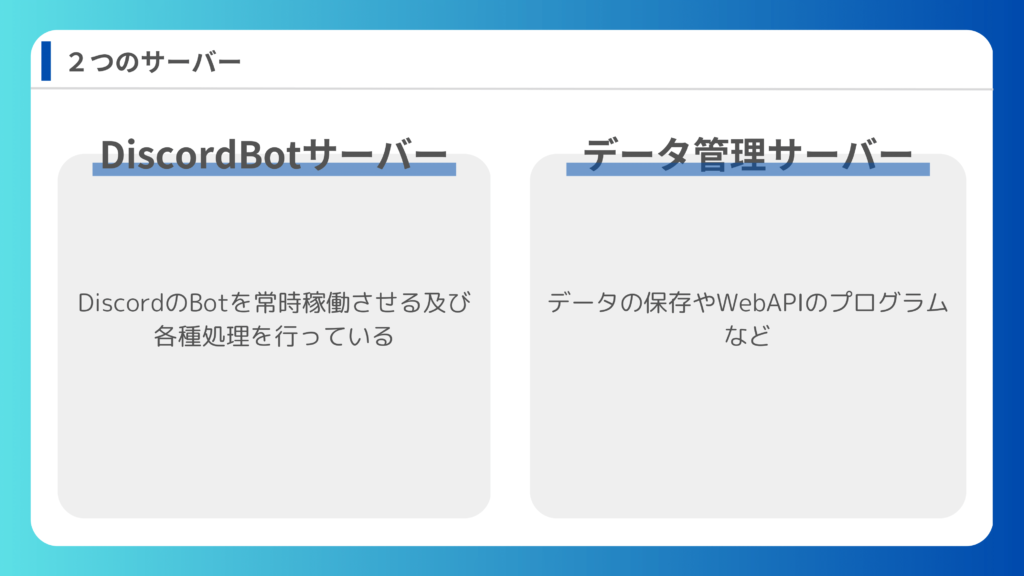 当システムは、主にDiscordBotサーバーとデータ管理サーバーの2つに分かれています。